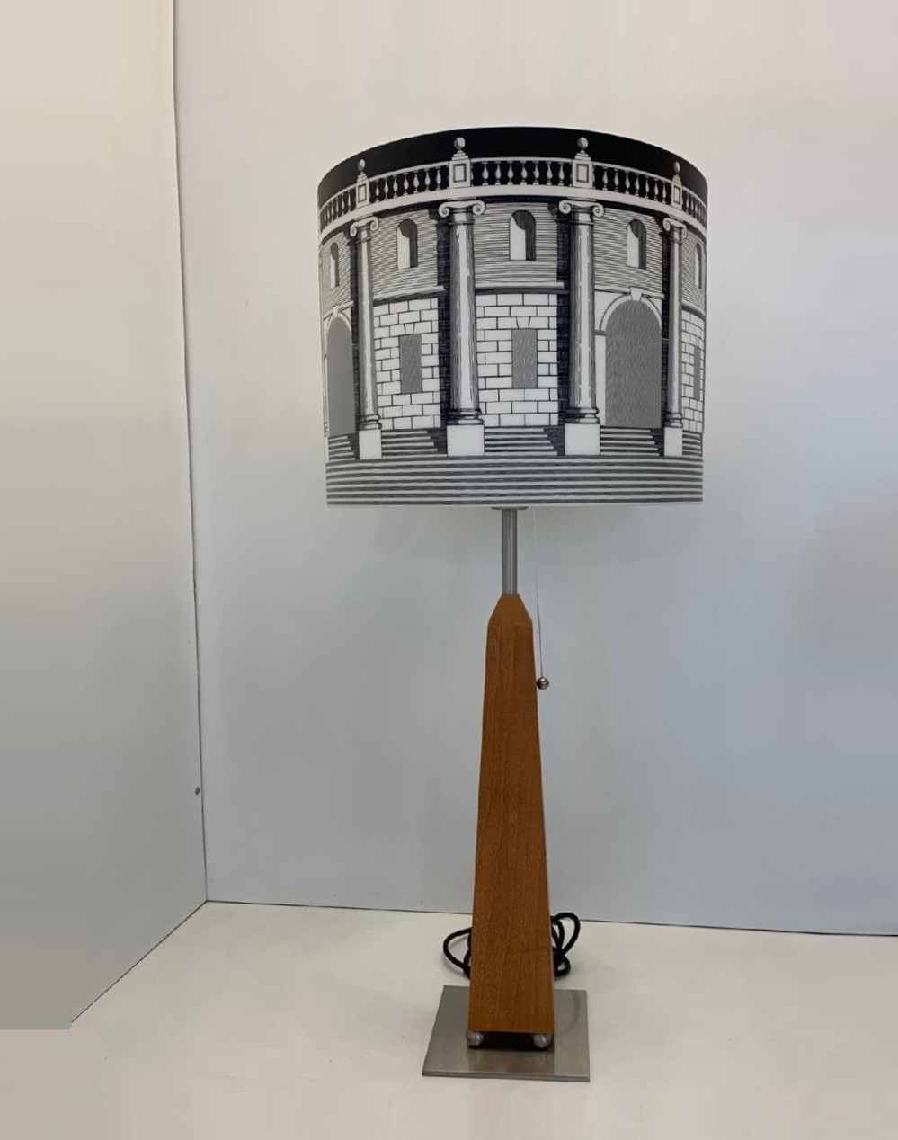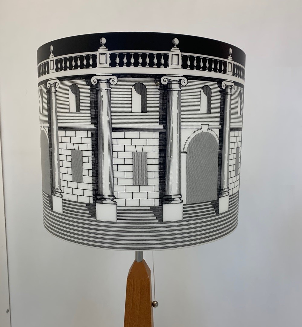 Lampada da tavolo realizzata dal designer Piero Fornasetti per il brand Antonangeli. Lampada con base in ferro nichel, fusto in legno a forma di obelisco, paralume con disegni architetture in polipropilene. Sorgente luminosa tramite attacco lampadina 1xE27 led (lampadina non inclusa). Un pezzo unico della creatività del designer Fornasetti. Design, qualità Made in Italy. ( Fornasetti – Antonangeli )
