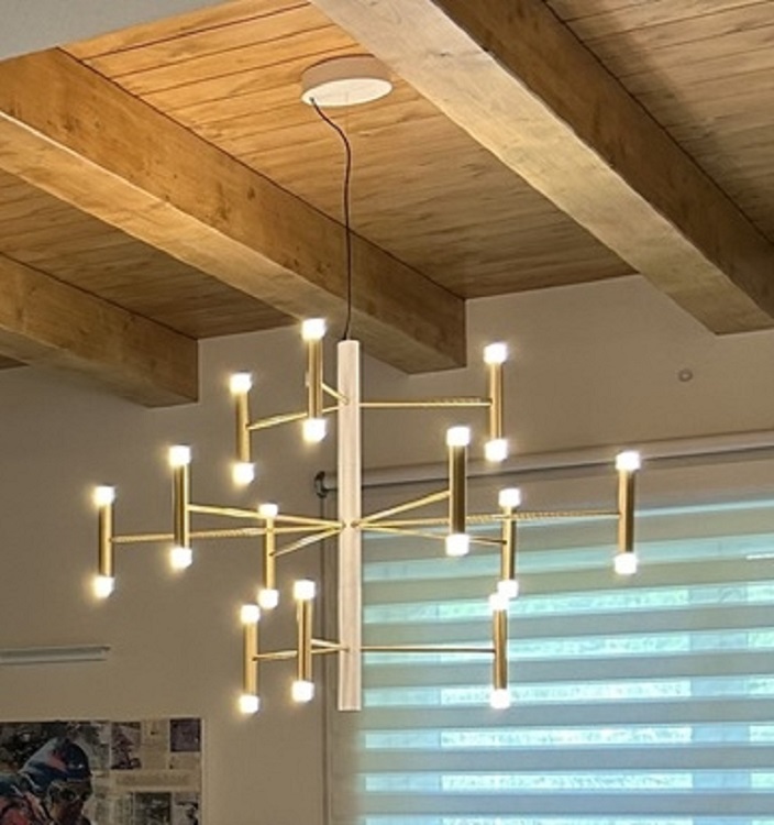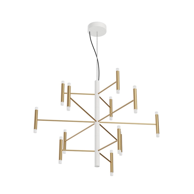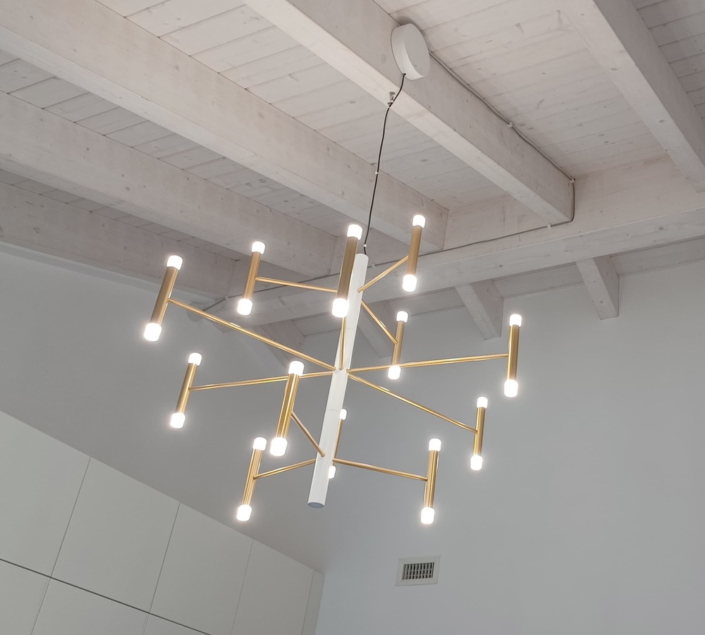 Sospensione Perla a 12 luci con sorgente luminosa a led integrato, realizzata con corpo centrale in alluminio verniciato texturizzato bianco, braccia e cilindri esterni in alluminio finitura oro spazzolato. Diffusori in polimetilmetacrilato sabbiato. Diffusione luce a led integrato da 53W 3000K 5644 lumen. Sospensione dal diametro di 102cm con cavo a lunghezza regolabile. Versatilità data dalla possibilità durante l’installazione di invertire la disposizione dei tre piani. Perla è una sospensione perfetta per illuminare contesti come la zona tavolo, ideale per ambientazioni in stile contemporaneo. Design, qualità esclusivamente Made in Italy. ( ditta Linea Light )
